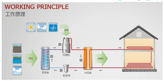 空氣源熱泵通過極少的電能吸收空氣中大量的低溫?zé)崮埽?jīng)過壓縮機(jī)的壓縮變?yōu)楦邷責(zé)崮埽瑐鬟f水中將水加熱,熱水通過地暖管用于供暖。