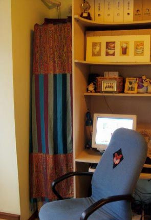現(xiàn)在上面那張的左邊空隙,我在淘寶上定做了一個(gè)架子,結(jié)果對(duì)方?jīng)]有嚴(yán)格按照我的尺寸,弄得兩邊都有點(diǎn)縫,也不好看,我很苦惱,想了半天,終于想到用一個(gè)自己的披肩給外面一搭 呵呵居然不覺得難看,藏了好多亂七八糟的東西哦。