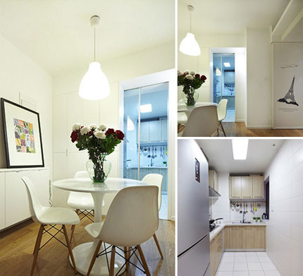 這個(gè)空間里大昨運(yùn)用白色系,廚房間的藍(lán)色玻璃顯得很突出。餐廳里的簡(jiǎn)潔裝飾,配合餐桌上的盆載。
