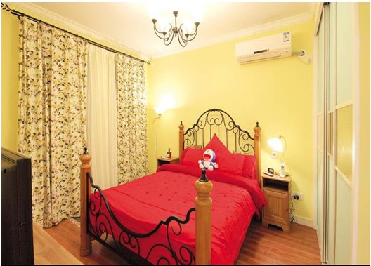 臥室中,一面圓弧形的陽臺(tái)墻造成了整體空間的不規(guī)則,這種房間通常有很大的落地窗,房間的層高很高,空間的自然采光條件很好,室內(nèi)光線充足。而且,弧線形的墻能給空間帶來活潑的氣氛,但家具很難擺放。解決的辦法就是將弧形的落地窗加上弧形的木窗格,環(huán)繞臥室大床,以突出弧形臥室的特點(diǎn)。然后再弧形房頂?shù)倪呇匮b上小射燈、床頭下部裝上地?zé)?,可令弧線形光線在空間中交相輝映。