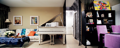 黑色花紋壁紙及圓形立柱散發(fā)出獨特氣味,純白色家具、紫色窗簾在深色中增添居室亮度。