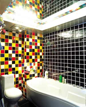 色彩紛呈的馬賽克很搶眼,玻璃天花板給浴室錦上添花。黑色墻磚給點(diǎn)滴色彩留下充足的發(fā)揮余地。