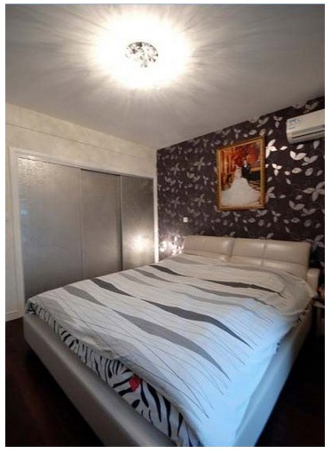 玄關(guān)處壁紙一直延伸到客廳沙發(fā)背景墻??蛷d棕色的沙發(fā)與墻紙色調(diào)一致。白色皮草及銀色靠枕,第一時(shí)間跳出大家的視線,有種小華麗的感覺。餐廳與客廳之間用了一圈?;u走邊,區(qū)分了客廳和餐廳的空間。