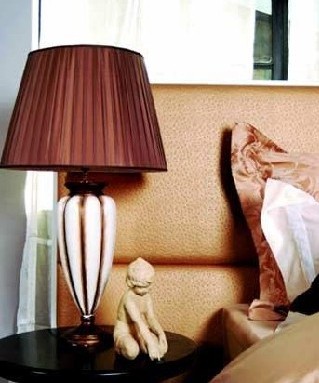 十,石雕人像和臺(tái)燈。不一定只有白色和藍(lán)色之類約定俗成的經(jīng)典用色才符合感覺,用淺金色冷金屬色調(diào)一樣能給視覺帶來清爽感受,如果再加一些白色或米色元素會(huì)更好。邊桌上的白色石雕人像和臺(tái)燈也讓床頭更具質(zhì)感。