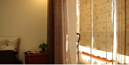 原先有一組傳統(tǒng)家具,一個三人位+兩個單人位實木沙發(fā)椅及茶幾、邊幾。為了更溫馨,也讓人坐進去更舒服和具備休閑感。我們把三人位實木沙發(fā)換成了藤制紅色布藝沙發(fā)。沙發(fā)是網(wǎng)購的,尺寸、藤編紋樣和布料都是精心挑選。當(dāng)沙發(fā)送到現(xiàn)場當(dāng)晚我就迫不及待去看,很滿意。沙發(fā)背景墻原先創(chuàng)意是水墨畫的藝術(shù)壁布,后來因為造價超預(yù)算決定放棄,現(xiàn)在看到的是請一個畫家朋友參照我們選的小樣而現(xiàn)場繪制的丙烯壁畫,沒想到出來的潑墨效果讓人驚嘆!客廳到西陽臺之間有兩扇移門,為了在移門開啟后能夠隱藏起來,特別設(shè)計了一組裝飾柜,顏色和飾品體現(xiàn)休閑文化與中國傳統(tǒng)文化的融合。沙發(fā)邊幾上的青瓷臺燈幾乎融入背后壁畫里。茶文化在中國源遠流長,試想在水墨畫中品著茶香的感覺是多么棒!