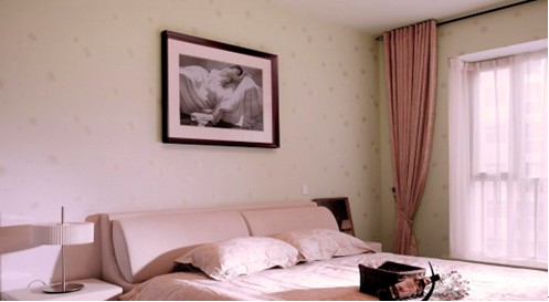墻上大幅照片很好體現(xiàn)床寢文化意境,淡雅細碎的圖案墻紙、粉紅色的床上用品、粉紅色窗紗、桃紅色的窗簾,體現(xiàn)主人細膩性格;