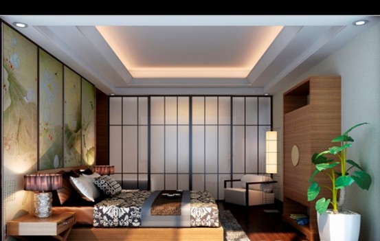 東方元素的水墨國(guó)畫統(tǒng)攝了室內(nèi)清新婉約的氛圍;磨砂玻璃的移門有增添了空靈迷蒙的氣芬;中式古典的燈具、床上用品與家具令人感覺清新脫俗;
