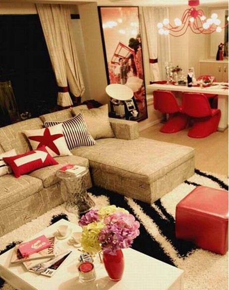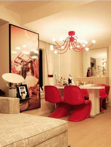 空間整體基調(diào)的黑、白、紅,在世上氣味濃厚的同時又可以帶上那一抹紅,喜慶,浪漫。整體空間在飾品的選擇上加一些黃、綠色。