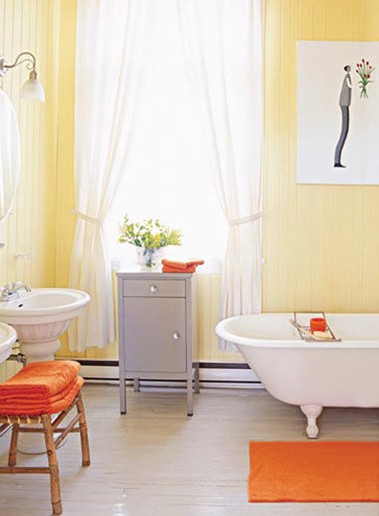 白色的背景墻面,大而透亮的窗戶,讓狹小的衛(wèi)浴空間變得舒適大方,白色產(chǎn)生的明亮雪白感,最具有反射效果,它將光線帶進(jìn)陰暗的室內(nèi),也可彌補(bǔ)空間的不足缺憾。而溫暖的黃色柔和,橙色明亮歡快,三色相撞搭出別具一格的浴室空間效果。