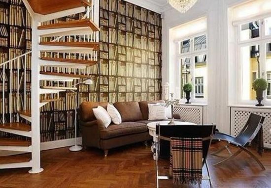 以咖啡色為主基調(diào)的大廳,從壁紙、沙發(fā)到二層樓梯,都以咖啡色為主角,以白色所謂配角,減輕咖啡色給人的暗沉感。值得注意的是,書柜樣式的壁紙,增加室內(nèi)咖啡色的層次感和立體感,給人以多重的視覺沖擊。