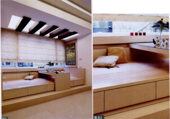 陽臺外推成休憩區(qū),而架高的平臺下方則利用抽屜及上掀式門片設(shè)計(jì)成收納柜,連柱間也規(guī)劃收納空間,讓空間更為整潔。