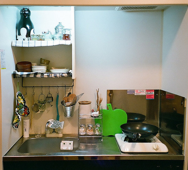 ?。停驼f,一個住的房子,不要空間太大,會覺得空曠,沒有安全感。小房子,都自己的手塞得滿滿的,反而更舒適。這個小廚房剛過1米5,卻是實用之極,油、鹽、醬、醋的瓶瓶罐罐擺放在各自應(yīng)有的架子上,小廚具的擺放利用墻面的空間立掛在水池對面的墻上,在上面的則是定制的小木柜,可以存放碗具。為了防止白凈的墻面有油煙污染,特地在爐子邊的墻壁上置上這樣的不銹鋼面板,易清潔。