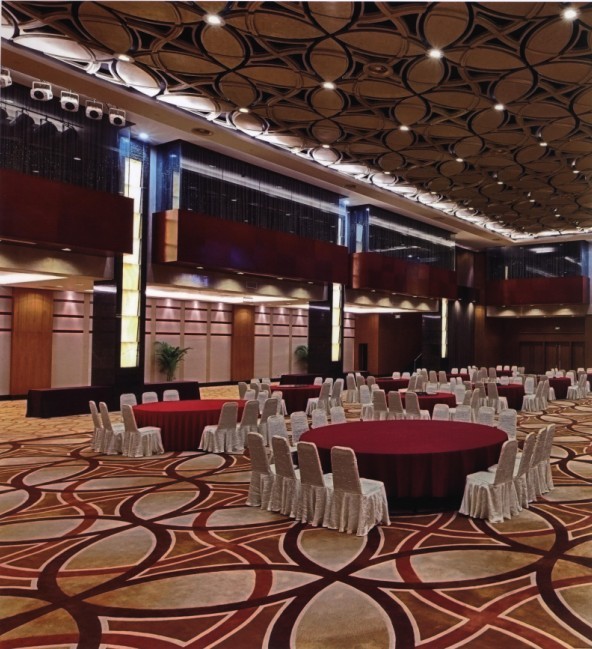 在這個酒店大廳的項(xiàng)目設(shè)計中,酒店宴會廳里內(nèi)部裝修以厚重暖色調(diào)來襯托莊重感。地毯圖案的設(shè)計與棚頂?shù)脑煨蛨D案相一致,形成空間上的視覺效果,使空間成為統(tǒng)一的整體,同時形成強(qiáng)烈的視覺沖擊。