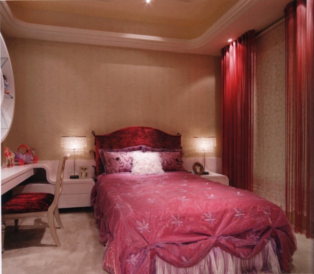 這個滿是浪漫情調(diào)的房間,它的情調(diào)是歸功于床上的裝飾品。用粉色的床單作為床的修飾元素,能夠表達(dá)出一種爛漫的情愫,就好似少女的情懷,讓人迷戀而又不可觸摸。顯然這個房間是女性的私密臥室。歐式的設(shè)計(jì)手法,暖色溫馨的色調(diào)成就臥室少女浪漫。