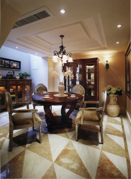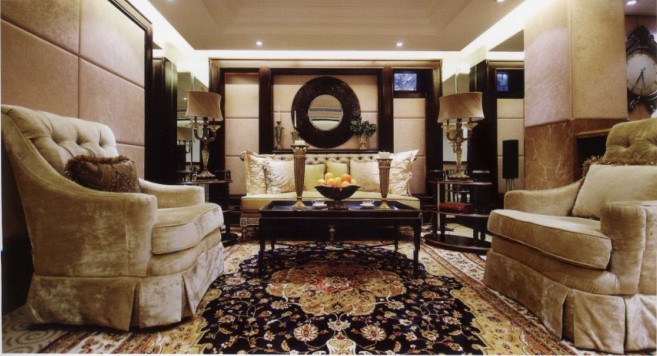 新貴族式風(fēng)格是尊貴、端莊的,因此對于材質(zhì)的選擇很是考究。大廳和公共區(qū)域的地面,以及衛(wèi)生間的墻面、地面,通常采用花崗石材拼花鋪貼。而臥室則采用滿鋪的羊毛地毯,或者實木地板結(jié)合手工塊毯鋪地。