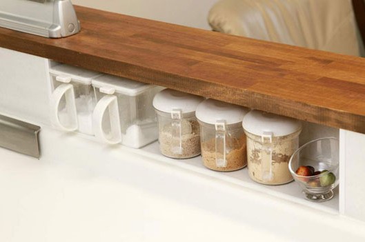 廚房內(nèi)側(cè)同外側(cè)一樣可以打造成內(nèi)嵌的隱形儲物格,經(jīng)典的透明材質(zhì)的調(diào)料罐隨意的擺放其中,既方便料理時(shí)拿取,又不讓一絲空間得到浪費(fèi)。