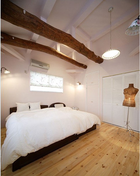 二樓的樓層距較高,在樓頂加裝兩條原木作為房梁,減少空間的空曠感。作為臥室,其實(shí)不需要太花俏,松木地板、木絹壁紙、純白床單的搭配,顯得樸實(shí)無華。