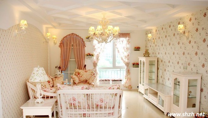 從上圖我們可以看出客廳整體布局都充滿著濃濃的田園氣息,客廳以暖色調為主,電視柜后面的墻紙選用的則是碎花做背景,凸顯出空間的清新自然,從側面我們可以看到沙發(fā)選用的是白色的框架,靠枕及坐墊選用的淡粉色表面印有花朵布藝,各個角落里擺放著插花,顯得整個客廳處處洋溢著春天的氣息。
