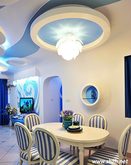 用白色和藍(lán)色為基調(diào)的搭配是比較典型的地中海顏色搭配。地中海的顏色特點(diǎn)就是,無(wú)須造作,本色呈現(xiàn),餐椅的藍(lán)色條紋像是海軍服一般的清新。地中海沿岸對(duì)于房屋或家具的線條不是直來(lái)直去的,顯得比較自然,因而無(wú)論是家具還是建筑,都形成一種獨(dú)特的**造型。如圖中的地中海式的吊頂,彎曲綿延而來(lái),如蓮花般綻放開(kāi)來(lái),給生活注入浪漫。圓形拱門(mén)的設(shè)計(jì)大大符合的地中海的風(fēng)格,與蜿蜒的吊頂相互呼應(yīng),在走動(dòng)觀賞中,出現(xiàn)延伸般的透視感
