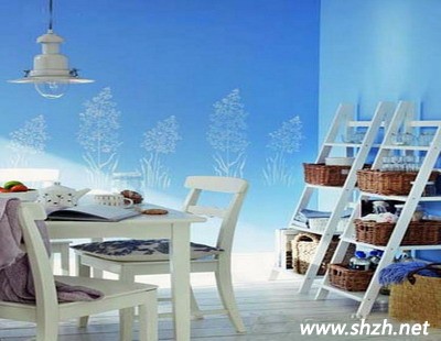 地面:純白色木地板與藍(lán)色墻面非常和諧的搭配在一起,在地板選購(gòu)上一定要實(shí)木地板才能達(dá)到預(yù)期的效果。
