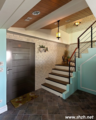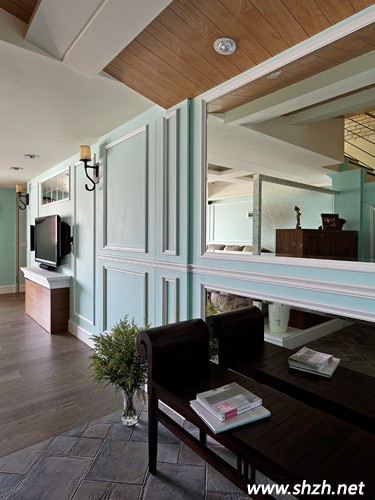 進入就已經(jīng)察覺了這個家庭設計的特點,淺藍色的使用讓室內(nèi)環(huán)境一下子年輕了起來,同時為了讓老人家在室內(nèi)生活的也比較舒適,天花板,墻面地面則使用了不太顯眼的淳樸色彩,看上去時尚卻不輕浮。