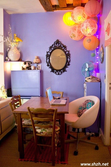 小小的餐廳融入了許多流行元素,紫色的墻面神秘而性感,歐式古典風(fēng)格的鏡子個(gè)性但是并不突兀,房間右上角燈籠樣式的照明燈是中國元素的應(yīng)用。如此小巧的空間卻可以讓諸多元素巧妙的共存,我們不得不佩服設(shè)計(jì)師的獨(dú)具匠心。之前就說過現(xiàn)在的餐廳不僅僅只是用來就餐了,那么就像這樣的一個(gè)小餐廳完全可以成為你家里的“辦公室”,獨(dú)特而美妙的享受。