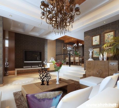 圖一:東南亞與英式混搭的客廳裝修,白色的吊頂是東南亞風(fēng)格裝修中最常用的手法,墻壁的花紋墻紙也著重體現(xiàn)了濃濃的東南亞風(fēng)情。但在色彩與家具的款式上主人卻無(wú)聲的融進(jìn)了大量的英式風(fēng)格,電視背景墻部分是這個(gè)客廳的中心,東南亞風(fēng)的花紋與英式風(fēng)的款式在這片小區(qū)域上完美的融合。