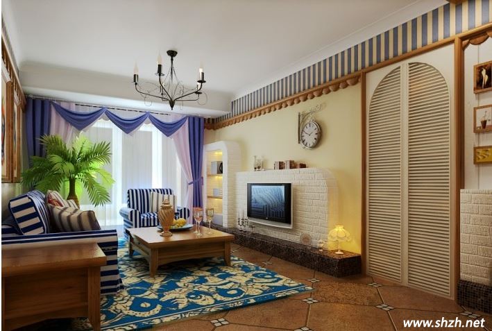 圖三:東南亞風(fēng)格的裝修不全是無(wú)比絢麗的,也可以清新浪漫。海洋條紋是近年來(lái)英倫風(fēng)中常見(jiàn)的表現(xiàn)手法,設(shè)計(jì)師把海洋風(fēng)帶進(jìn)了色彩濃郁的東南亞風(fēng)中,兩者竟然協(xié)調(diào)出意想不到的清新脫俗;其中電視背景墻簡(jiǎn)單又不失別致,淡淡的黃色與整個(gè)客廳的彩色融合得很好。