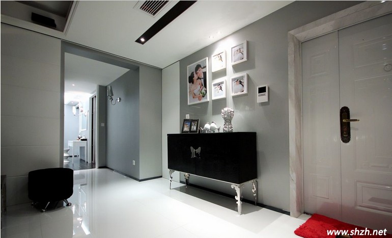 白色是古典的一種色彩,在居室裝修中,使用白色為主色調(diào),能夠使整個室內(nèi)看起來更加寬敞明亮,大方得體。而黑色則給人帶來神秘的恐懼感,也許很多人在裝修中都不敢使用黑色進行裝飾,其實,黑色與其它的色彩合理搭配,也能產(chǎn)生別樣的風(fēng)采。從古至今一直流傳這樣一個詞“黑白配”,黑白永遠是最配的色彩??催@款設(shè)計,以白色為主,黑色家具作為裝飾,用現(xiàn)代的手法和材質(zhì)還原古典氣質(zhì)。黑色精致的皮質(zhì)沙發(fā),豪華而大氣,融合了各種豐富的元素,傳統(tǒng)中帶著現(xiàn)代奢華的氣質(zhì),而材質(zhì)細膩、做工精細的抱枕,彰顯奢華高貴的氣質(zhì),體現(xiàn)出主人對生活的高要求以及對生活的熱愛。墻上的婚紗照,明顯的后現(xiàn)代風(fēng)格,溫馨浪漫的情調(diào)深深吸引著我們。而紅色的地毯寓意著熱情似火的愛情觀念,且為這淡雅的居室情調(diào)增添了幾分活躍的氛圍。