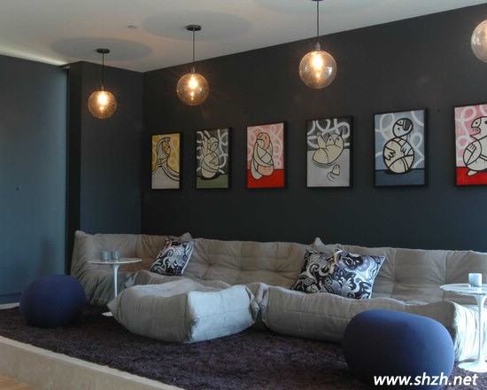 方案二:復古風是現(xiàn)在的當紅明星,無論是潮流的80、90后,還是保守的70、60后,復古風都能一起特有的風采俘獲他們的心!DIY又是復古中最愛,看這間客廳中的沙發(fā)與吊燈,都選用了上世紀的款式,與現(xiàn)代感強烈的照片墻無意間形成對立面,這樣的對立卻意外的和諧,我想這大概是深藍色墻壁與褐色毛絨地毯的功勞。