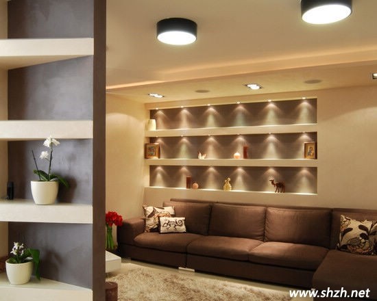 方案三:無需刻意的強調照片墻的存在,從墻壁中“借”出來的置物架大大節(jié)省了室內的空間,每一排都裝上小射光燈,再擺放上滿意的自戀照片,這還需要你刻意的去點明嗎?它們已然成為了客廳中的主角。