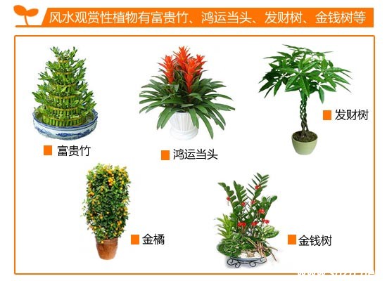 富貴竹、鴻運當(dāng)頭、蓬萊松、七葉蓮、發(fā)財樹、金錢樹、招財樹、君子蘭、蘭花、仙客來、桔等植物因為其名稱蘊含吉祥如意、恭喜發(fā)財?shù)脑⒁?,而頗受人們歡迎,被當(dāng)做家居風(fēng)水的裝飾???。