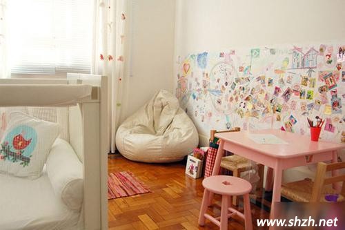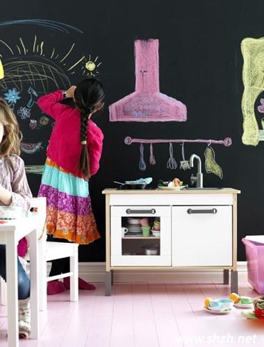 是否為孩子喜歡在墻壁上畫(huà)畫(huà)而煩惱呢?是否擔(dān)心寶貝將剛剛弄好的潔白的墻壁弄臟呢?那就專門(mén)騰出一面墻壁,作為寶貝的畫(huà)板吧。這面墻壁上,我們可以將孩子平時(shí)畫(huà)的作品隨意貼在上面,不僅起到了裝飾作用,而且還能將這些看似無(wú)用的東西利用起來(lái)。同時(shí),也可以將家中的一面墻作為一塊黑板,可以讓孩子隨意在墻壁上涂鴉,用彩色粉筆,描繪美好的生活,孩子在學(xué)習(xí)中遇到的一些問(wèn)題也可以在黑板上教會(huì)他們。