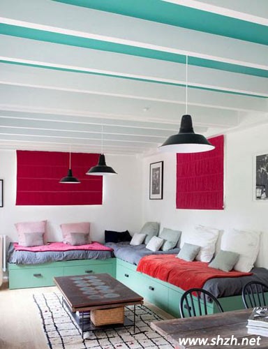 臥室是休息的重要場所,人的一天1/3的時間是在床上度過的,因此,臥室一定要以溫馨舒適,能有助于人的睡眠為主。這款設(shè)計就特別的簡單溫馨。淡綠色;與白色相搭配就是挺不錯的視覺效果。而且映入眼簾的床頭那一面不規(guī)則鏡子也是很有趣味的,裝飾效果非常好。