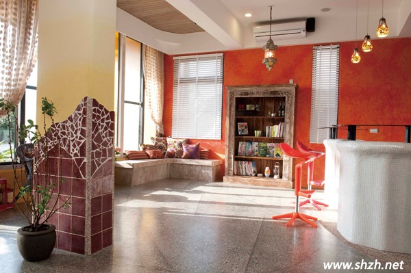 進(jìn)入民宿的第一眼便會看到這間橙橘色的大廳,瑰麗的色彩引爆心中的熱情,且讓暖陽的氛圍醞釀休憩的心情,搭配上深藍(lán)色的吧臺避免,令人直呼設(shè)計師對于空間用色的大膽。小巧的馬賽克吧臺是民宿主人吳大哥夜間最佳表演場所。