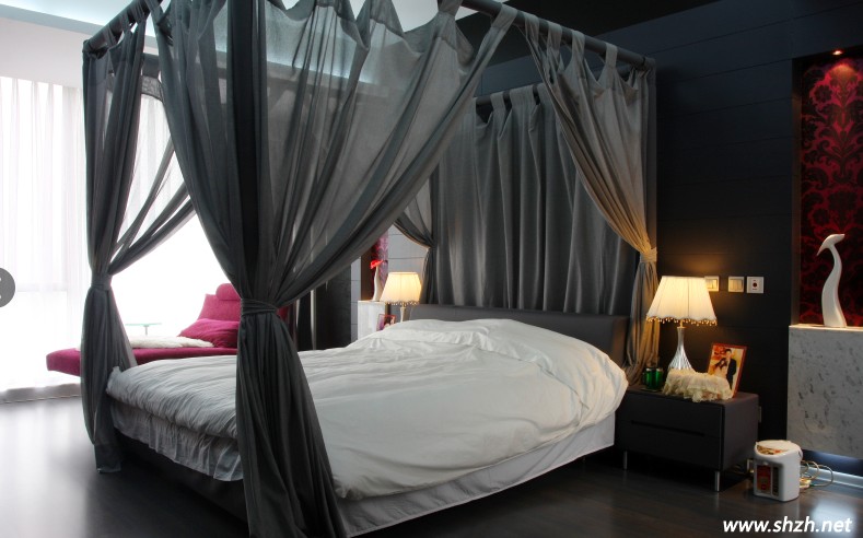 除了白色的床單和紅色的點(diǎn)綴以外,其他空間都充滿著深深的灰色,讓臥室環(huán)境顯出高貴的氣質(zhì),這是灰色臥室的魅力,灰色調(diào)臥室一向給人以沉穩(wěn)安逸的感覺。落地的純灰色蚊帳是不是有氣勢磅礴的感覺。
