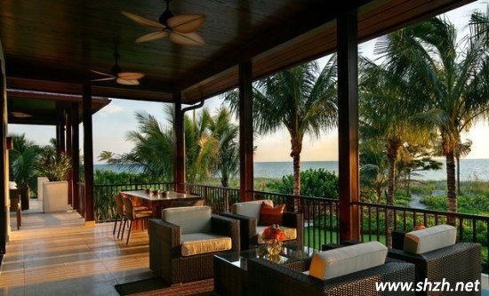 高檔的軟皮沙發(fā)在如此美麗的海邊風(fēng)景會(huì)讓人覺(jué)得格格不入,但是卻與統(tǒng)一色調(diào)的木板吊頂相互融合,讓混搭也顯得特別。
