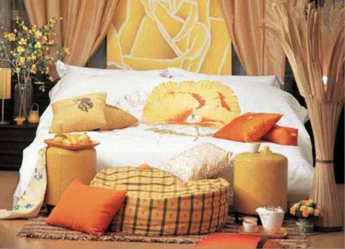 明亮的黃色給人感覺熱烈明快,不同的黃色搭配在一起,燦爛奔放之中又有著沉潛妖嬈的印象,帶來溫暖熱烈的視覺感受,是非常適合節(jié)日的一種臥室顏色搭配。