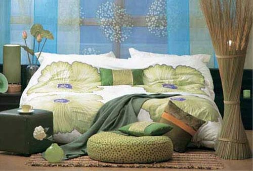 這間臥室以白地草綠色大花的床品,搭配團(tuán)花紗質(zhì)窗簾,在床腳的懶骨頭靠枕、方墩椅、落地?zé)艉痛差^的綠色臺燈、荷花等的強(qiáng)調(diào)和呼應(yīng)下,成功地搭配出了一個(gè)綠意盎然的臥室。