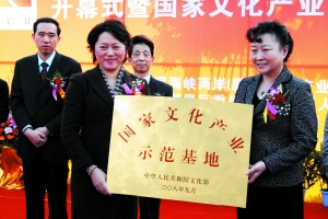 中國(guó)建筑裝飾協(xié)會(huì)會(huì)長(zhǎng)馬挺貴(左五)參加文化部向漆寶齋授牌的開(kāi)幕儀式