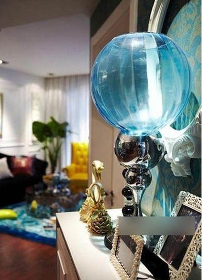 沙發(fā)邊上的臺燈也很不錯,下面是透明玻璃的,里邊還可以裝一些自己喜歡的東西做裝飾。