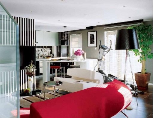從玄關(guān)處看客廳里,入眼的便是這個造型獨特的紅色沙發(fā),活躍了一整層的空間氣氛,讓空間不再單一,呈現(xiàn)外向歡快的一面。