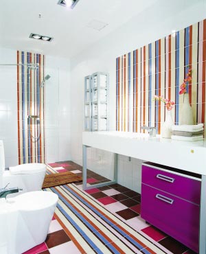 對(duì)于一些人來(lái)說(shuō),如果僅僅是一面墻,一定覺(jué)得無(wú)聊至極。即便是藍(lán)色或者黃色,時(shí)間久了依然會(huì)感覺(jué)厭倦。連落地鏡和拉絲鋁浴室家具都閃著光芒躍躍欲試,那么,為什么不用最大膽的POP花色瓷磚拼貼整面墻壁沖擊視覺(jué)神經(jīng)呢?