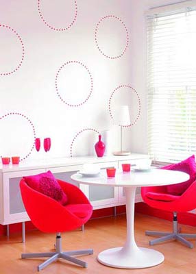 以亮白色為底色,在墻面上涂裝紅色的圓圈圖案,這種主題墻的效果引人注目。像是一匹放大的椅子包面,產(chǎn)生出奇妙的視覺幻象,適用于裝飾起居室,同時(shí)也適用于臥室。為了增加趣味性,嘗試用時(shí)髦獨(dú)特的紅色油漆裝點(diǎn)房間的踢腳板,標(biāo)新立異。