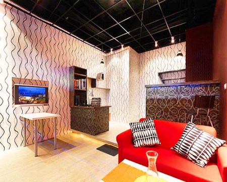 方案一:波普藝術風格以亮白及暗紅兩色壁紙將空間一分為二,暗紅色規(guī)則波紋線條壁紙從沙發(fā)區(qū)一路延伸至后方吧臺區(qū)塊,亮白色不規(guī)則波紋線條壁紙則占滿了大片室內空間;在休閑區(qū)選用安定感色系波紋,在工作區(qū)選用活潑明亮風格壁紙,具象的沖突感在設計師巧手下呈現(xiàn)微妙平衡,再搭以藤蔓編飾圖紋深色壁紙包覆的吧臺及工作臺,擺上大紅及亮白的造型沙發(fā),營造lounge bar氛圍,成為寓工作于娛樂的工作空間。