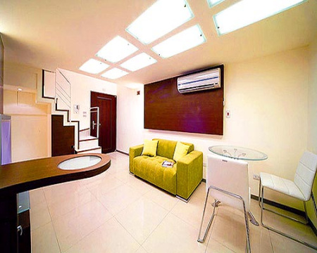 方案二:現(xiàn)代機能 實用至上 沙發(fā)背后的鐵刀木簡約背墻,既包覆住冷氣管線,在近門處一側并裝有感應式照明,用溫暖光線歡迎返家的居住者,另外三側亦設置間接光源,讓空間光影表情更生動。本案設定為投資用途,天花板的幾何方塊設計,遮掩丑陋的日光燈管,維修方便,且分段式開關發(fā)揮節(jié)源功能,明亮的光源,做為住屋或是小型工作室出租皆無問題。