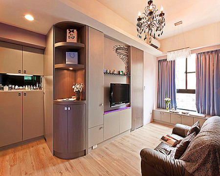方案三:現(xiàn)代簡約風格 家具的設定特別選擇較低水平線的小型家具,客廳墻面不設置電視柜,選擇小型視聽柜、茶幾,讓挑高的空間感覺更加放大。以架高地板的方式,設置小階梯,將臥鋪與客廳明確分別開來,并利用兩者地板間的落差,規(guī)劃抽屜式的收納柜,增加小空間里的收納功能。