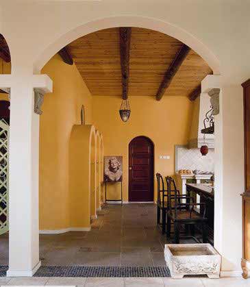 餐廳和廚房是開敞式的,拱形造型巧妙地把兩個空間相連,若即若離,拱形是歐式建筑中最常見的,圓潤的造型令人呼吸到田園的舒適和寧靜。而在餐廳與廚房的交界處,講究實用的主人特意定制了一套整體收納柜,將餐具酒器一一收納其中。