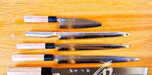 這些刺身刀按外形可分為兩類,一類刀背較厚,有將近半寸,尖頭短身,多用來(lái)斬魚頭及起魚肉,可以輕易斬?cái)圄~骨,稱之為出刃庖刀。另一類則稱為柳刃庖刀(又稱萬(wàn)能刀),刀鋒薄而刀身較長(zhǎng),用以將大塊魚肉切成等份或切片狀的刀,如果按用途分,則可分為去鱗、橫剖、縱剖、切骨等用刀。
