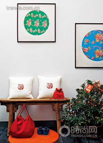 玄關(guān),是一個家最先要展現(xiàn)給大家的地方。如何在春節(jié)里把自家的玄關(guān)打造得與眾不同呢?讓我們來看這個玄關(guān):用美麗的民間花紙裝裱成的裝飾畫,開門見山地烘托出了節(jié)日的氣氛,中國風(fēng)味撲面而來。一條古舊的小條凳,兩個溫暖的靠包,營造出家的溫馨氣息,又有實用效果。橙色的圓地毯,色彩艷麗,造型可愛,可以隨意地放置包袋。